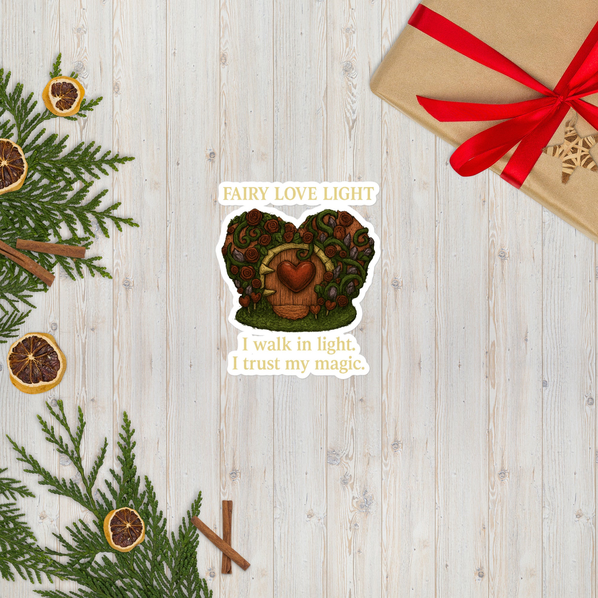The Fairy Love Light Door was lovingly created as a portal of imagination. Vines, roses, and amethyst crystals shimmer around its frame, while a radiant heart glows at the center.